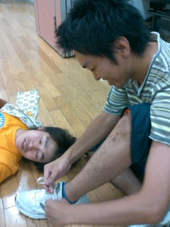写真は子供の顔して靴紐結ぶ石井さん(右)と、子供の顔して肉体美リー君(左)です。