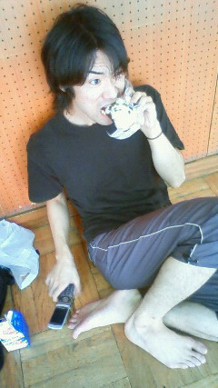 栄養補給にまめパンをほおばるじゅん